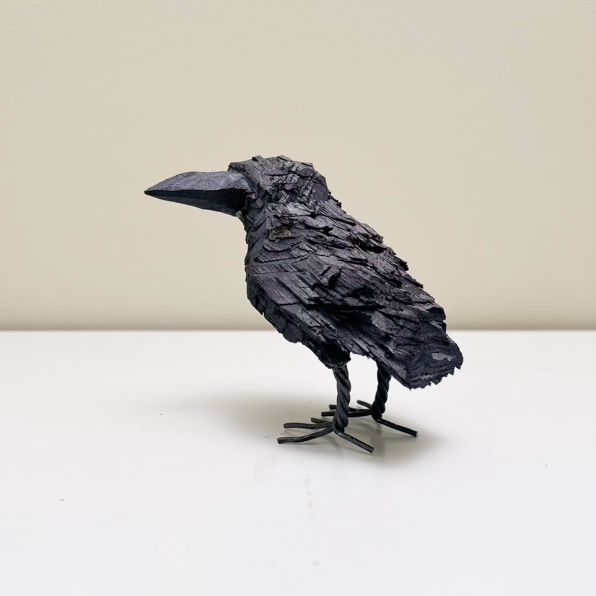 Fågel i svart trä med metallben. Ca 10 cm hög.